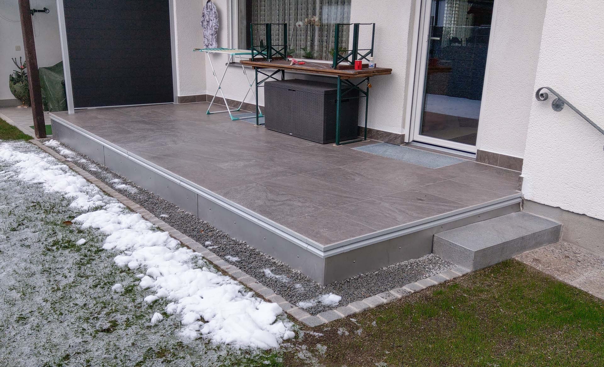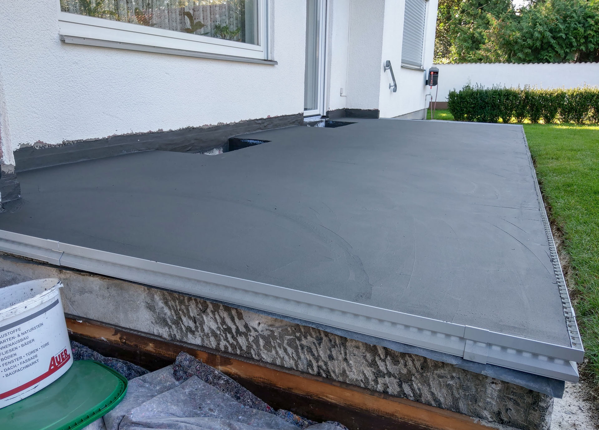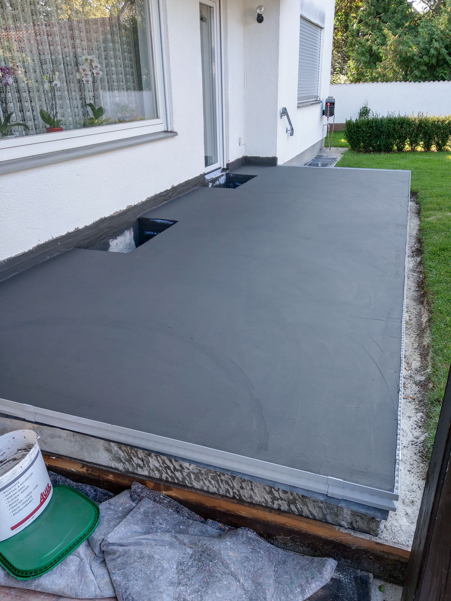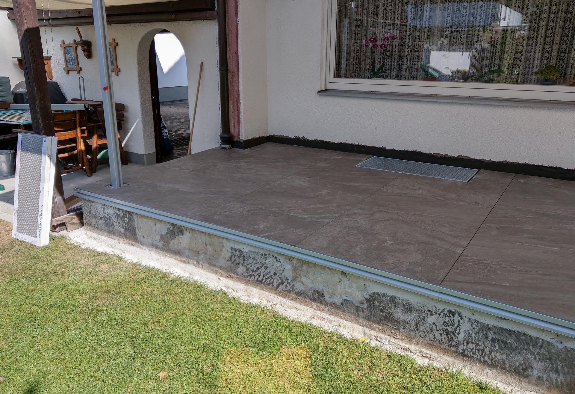 Zunächst haben wir hier den Fliesenbelag und Altestrich abgerissen. Anschließend erfolgte der fachgerechte Neuaufbau Gefälleestich mit 1,5% – 2% Neigung. Spezielle Gutjahrprofile haben wir danach umlaufend an Stirnkante angebracht und mit nachfolgender 2K Verbundabdichtung verbunden. Der Aufbau des bewährten Terrachamp Systems gliedert sich auf in: